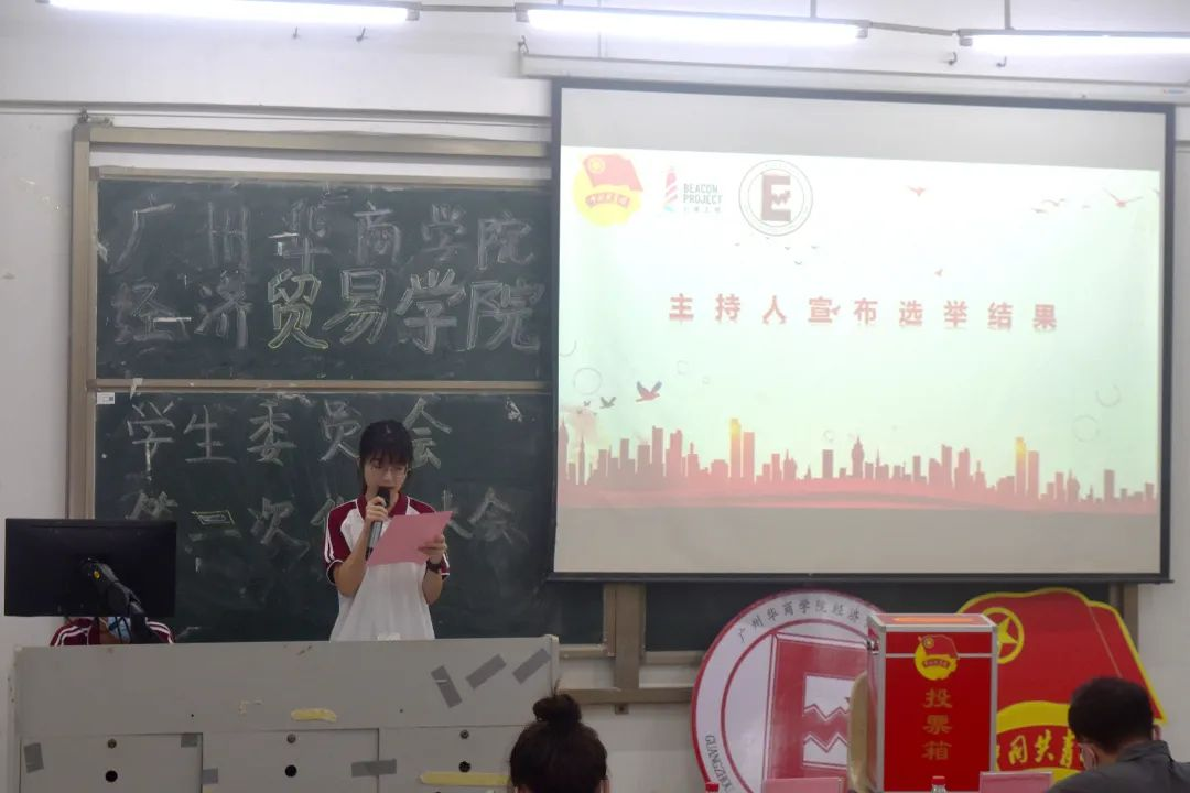 晚上七时四十分,由何绮琪同学主持会议。总监票人宋元跃老师宣读学生委员会的选举结果,主持人宣布伟德体育经济贸易学院第二届学生委员会委员名单。