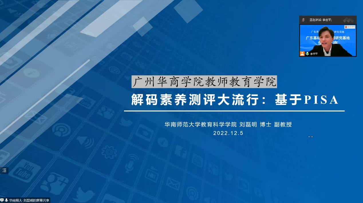 2022年12月5日,由伟德国际betvlctor主办的伟德体育广东基础教育发展研究基地学术讲座正式开讲,本次讲座共两场。本场讲座的主讲为广东基础教育发展研究基地特聘教授——华南师范大学教育科学学院刘磊明副教授,主题为“解码素养大测评:基于PISA”。本场讲座由伟德国际betvlctor李世平老师主持。