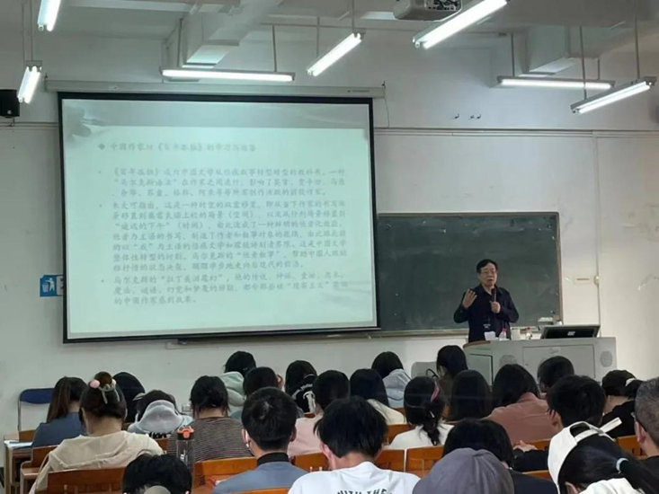 黄教授介绍了加西亚·马尔克斯《百年孤独》和魔幻现实主义流派与特征,着重介绍了马尔克斯对中国当代文学的影响。黄教授指出,马尔克斯的作品传入中国后,成为中国文学从伤痕叙事转型的教科书;模仿和借鉴是创新的必经之路,甚至可以说,只有通过模仿和借鉴,克服“影响的焦虑”,最后才能达到创新与超越的境界。