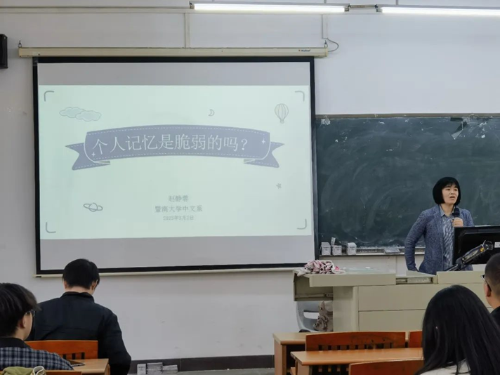 赵静蓉教授是暨南大学文学院教授、博士生导师,广东省高校“千百十”人才工程省级培养对象,广东省珠江学者特聘教授。3月2日下午,赵静蓉教授在增城校区励志楼C303教室为2021级汉语言文学专业菁才班同学作了题为“个人记忆是脆弱的吗?”的学术讲座,由文学院副院长蒋家国教授主持。