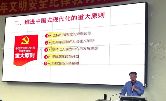 在“为什么要走中国式现代化道路”这个问题上,王教授向同学们解释道:一是因为世界百年未有之大变局加速演进,加快发展、顺利发展、健康发展成为唯一出路;二是由于我国国情所需,我国仍处于并长期处于社会主义初级阶段;三是走中国式现代化道路是人民所盼之路,也是必经之路。王教授还指出,要推进中国式现代化,必须牢牢把握五个重大原则。
