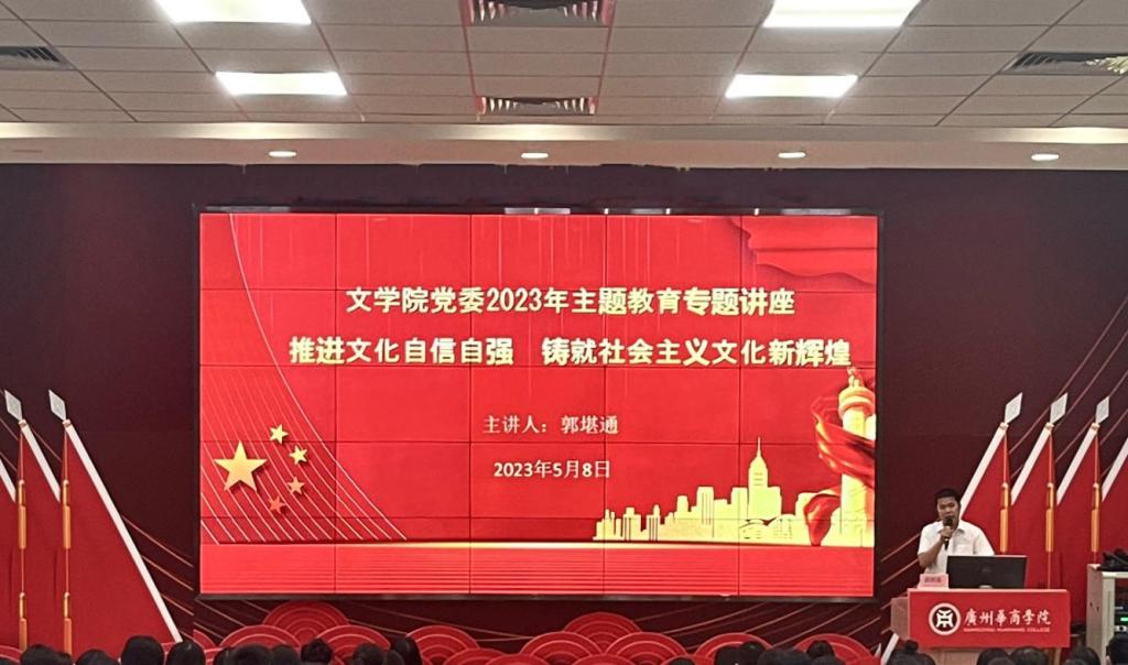 5月8日晚上,文学院党委在励志楼C408课室开展学习贯彻习近平新时代中国特色社会主义思想主题教育专题党课。本次专题党课由文学院党委副书记郭堪通主讲,文学院党务组织员姚婉雯老师主持,学院各党支部书记、辅导员以及学生党员代表共计300余人参加。