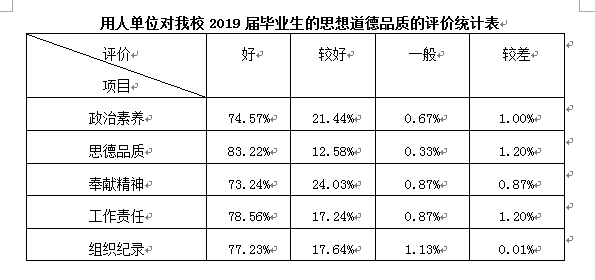 用人单位对我校毕业生各方面评价均比较高:政治素养、道德品质、奉献精神、工作责任、组织纪律等满意度均在95%以上