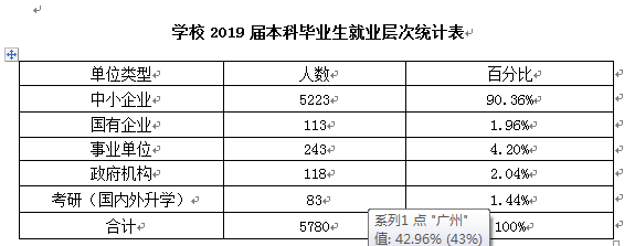 学校人才培养的目标是为广东中小企业及社会服务机构培养理论基础厚,实践能力强、综合素质高的高级应用型人才。从就业流向来看,学校2019届毕业生主要集中在中小型企业就业。学校的就业单位类型统计情况请参看表2和图1